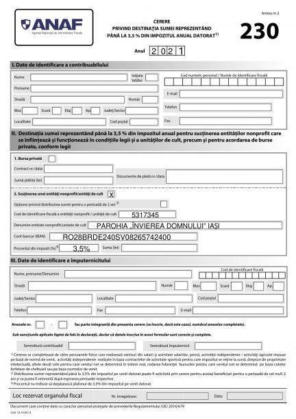 Vă rugăm să completați FORMULARUL 230- cererea pentru direcționarea a 3,5 % din impozitul pe venit (din anul 2021), în care au fost adăugate datele Parohiei „Învierea Domnului” Iași, în vederea sprijinirii lucrărilor de construire a noii biserici.